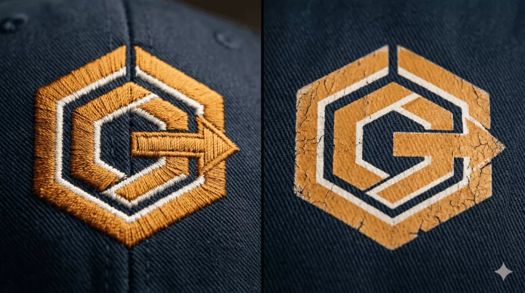 Werdykt: Jeśli Twoje logo to tekst + prosty symbol (jak u 90% firm) — haft wygląda lepiej. Nadruk ma sens przy skomplikowanej, wielokolorowej grafice.