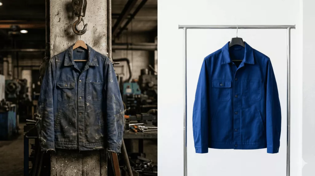 Brudna kurtka na hali. Przetarty kombinezon na budowie. Koszulka z plamami u klienta.